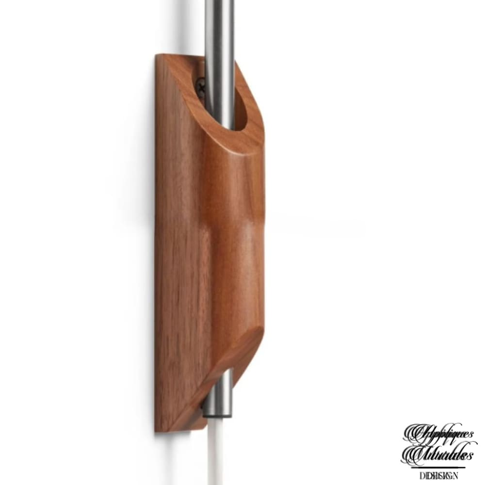 Le socle en bois, aux lignes naturelles, contraste avec le bras métallique élancé, qui se fond discrètement contre le mur.