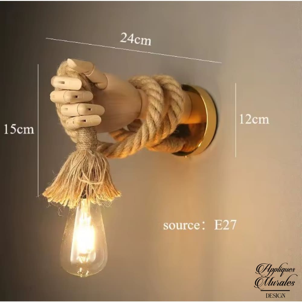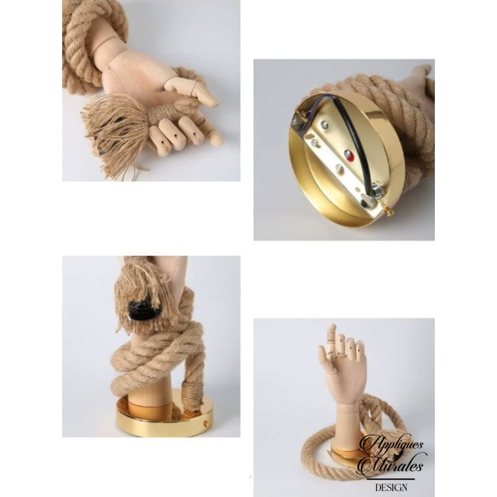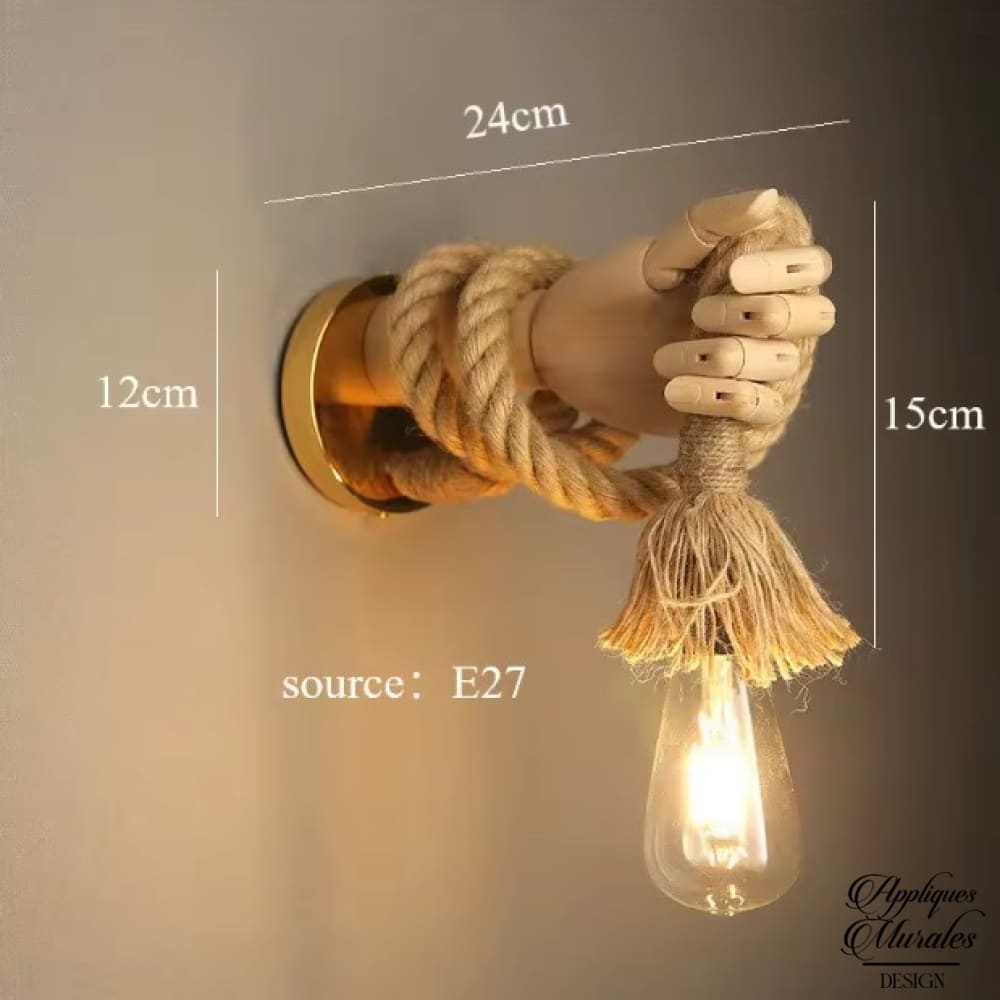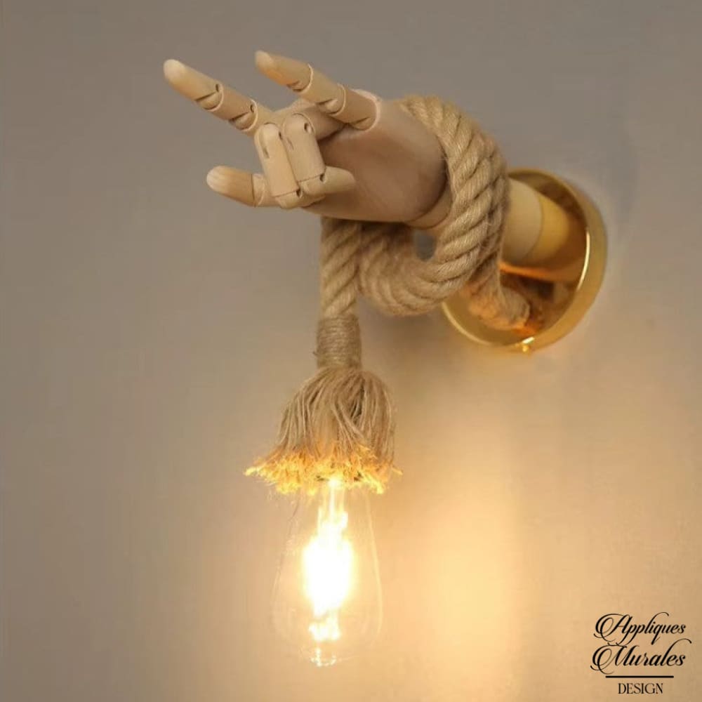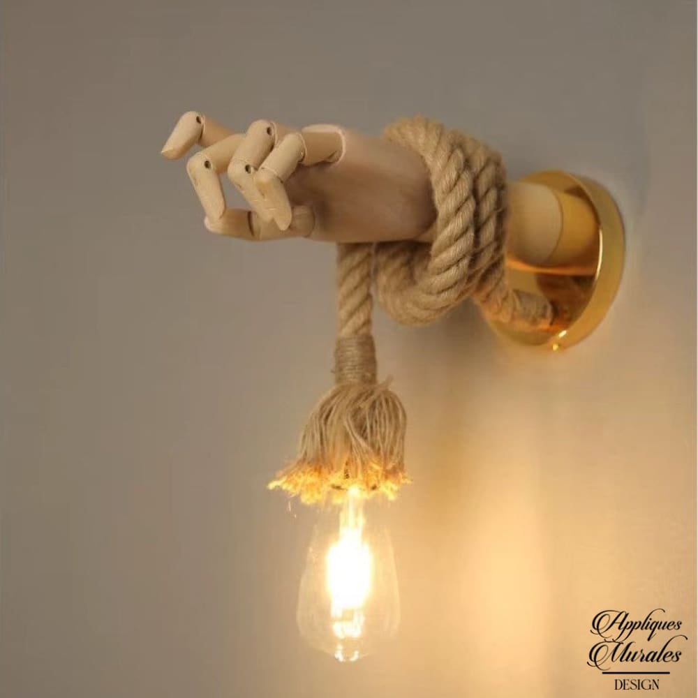 Applique murale main : Doigts articulés et corde de chanvre – Une création originale pour un éclairage créatif.