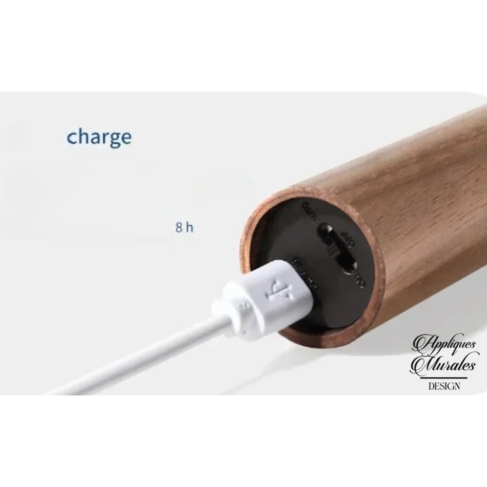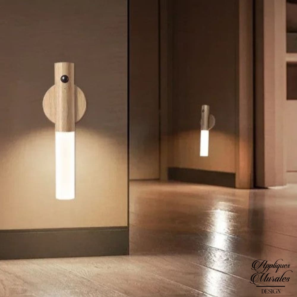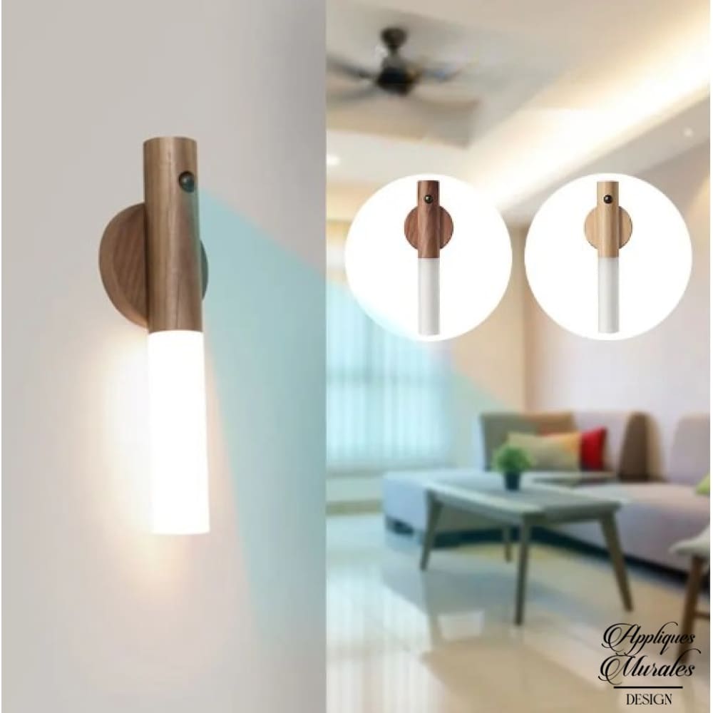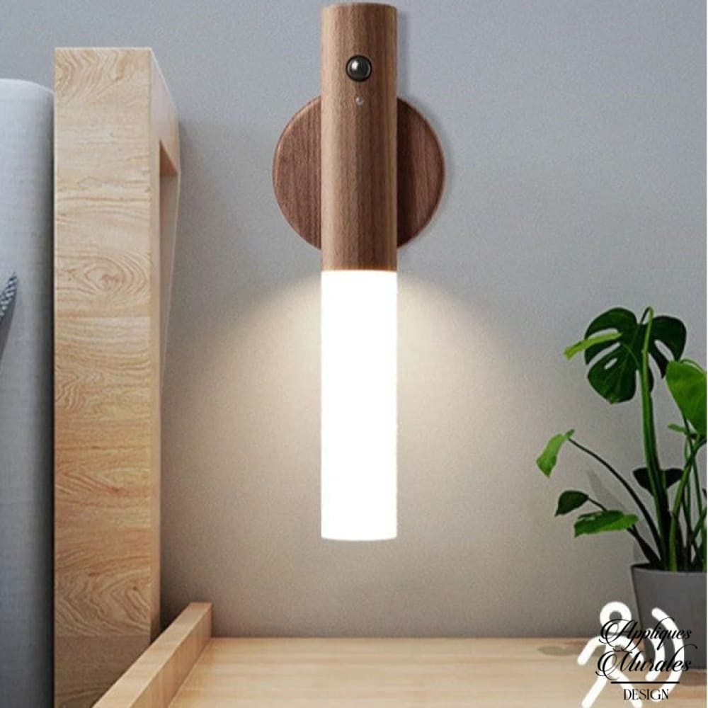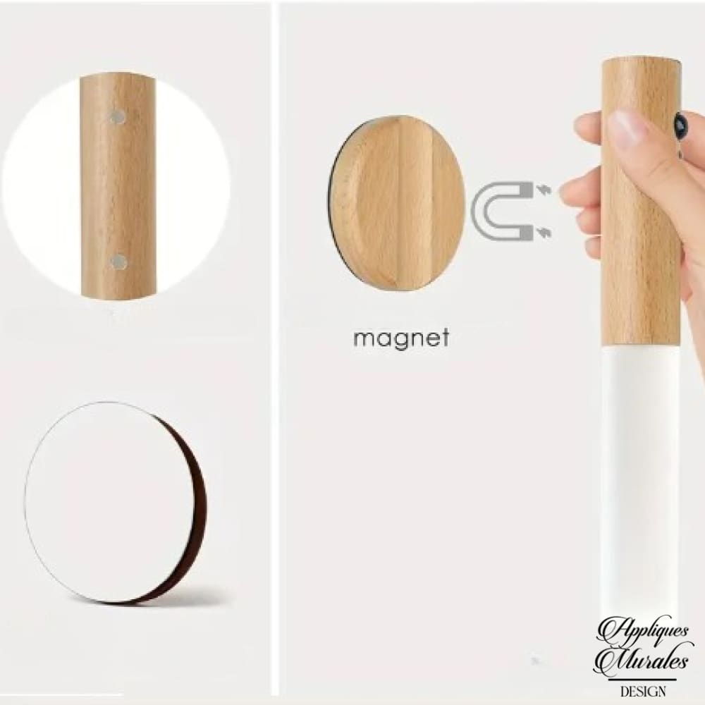 Applique murale aimantée : le bâton lumineux et son disque pivotant aux finitions bois élégantes.