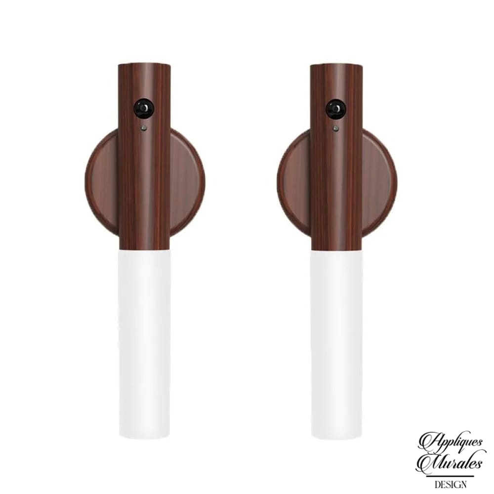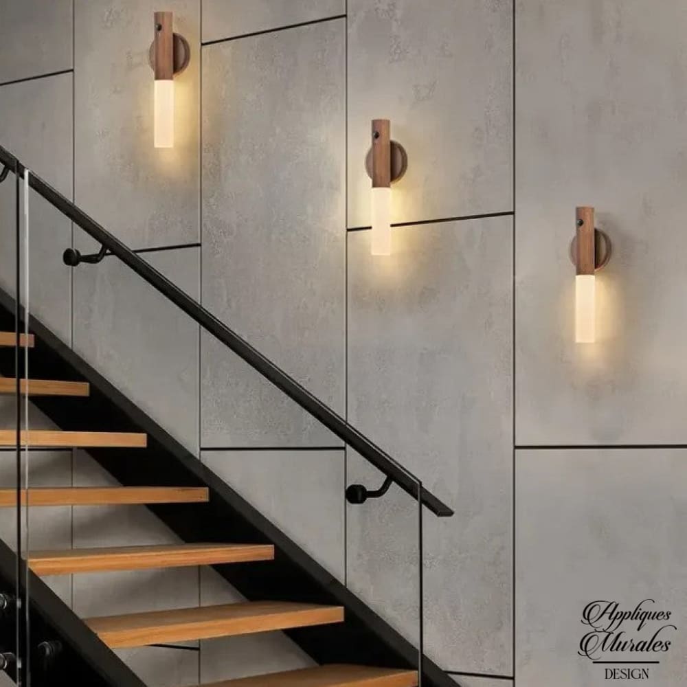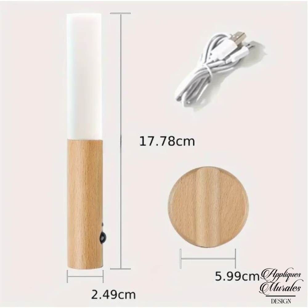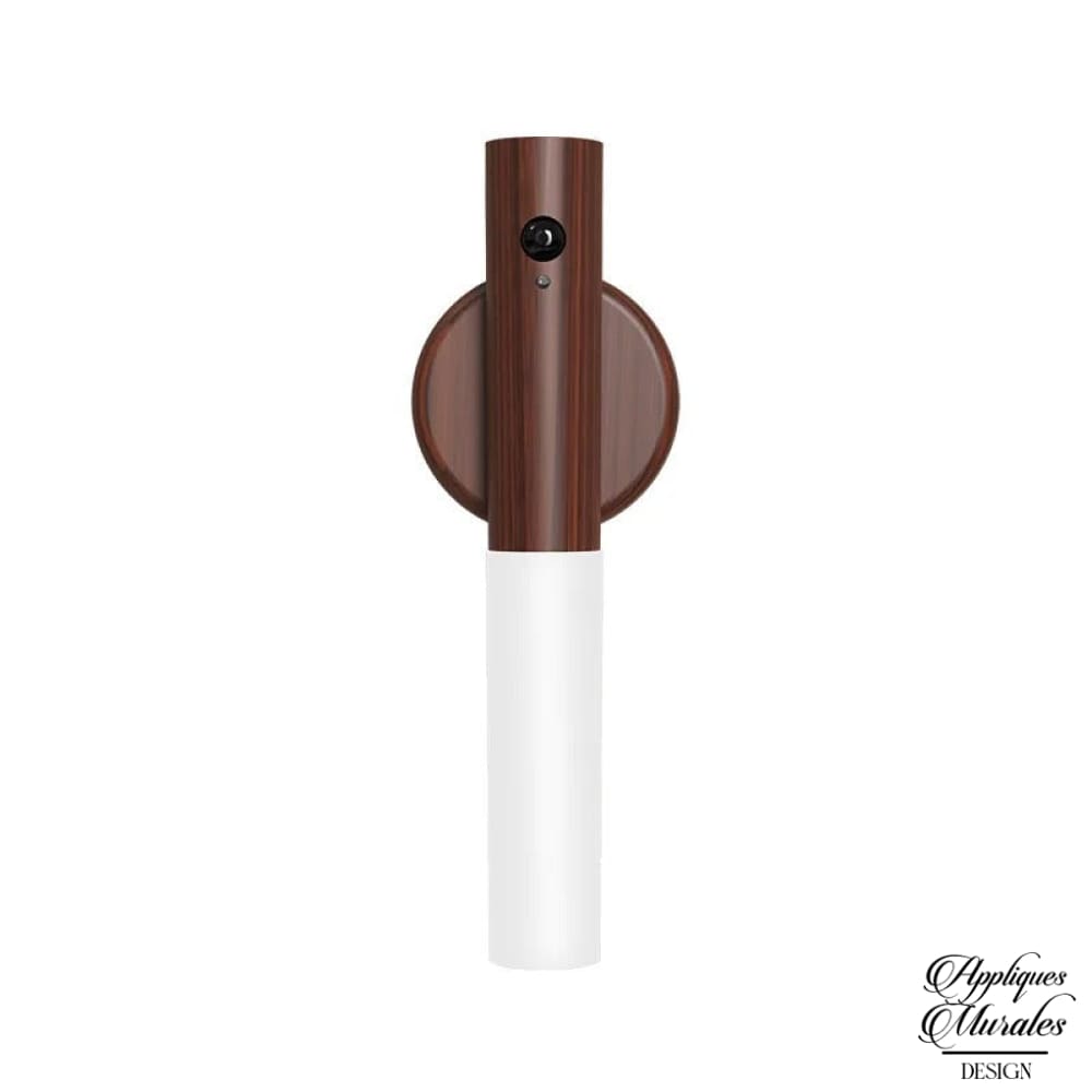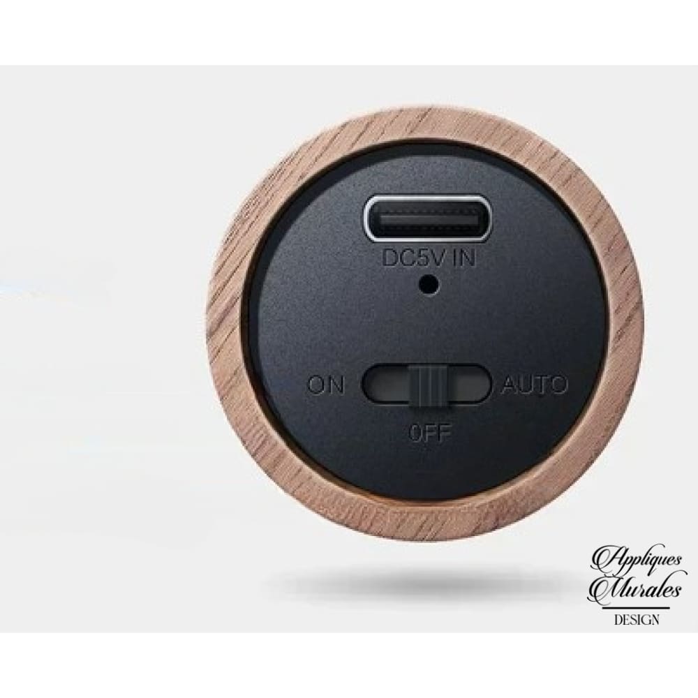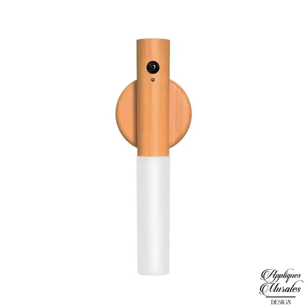 Applique murale aimantée : le bâton lumineux et son disque pivotant aux finitions bois élégantes.