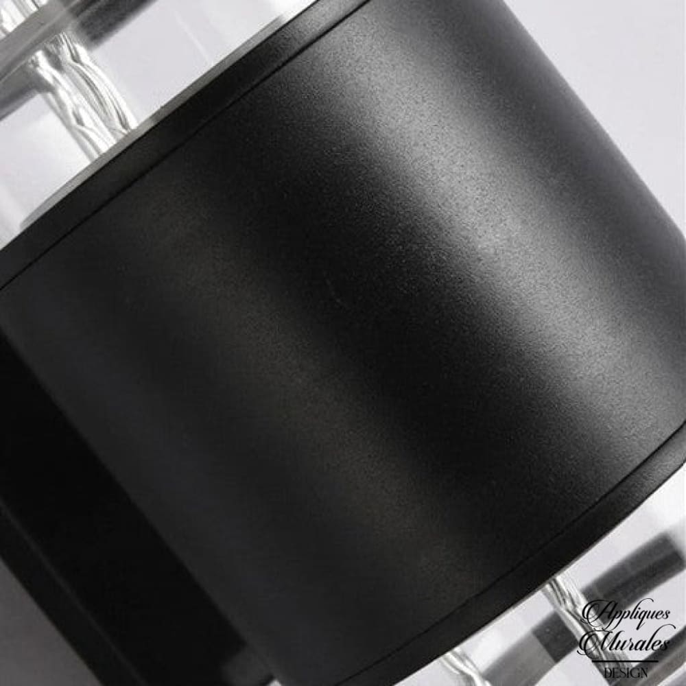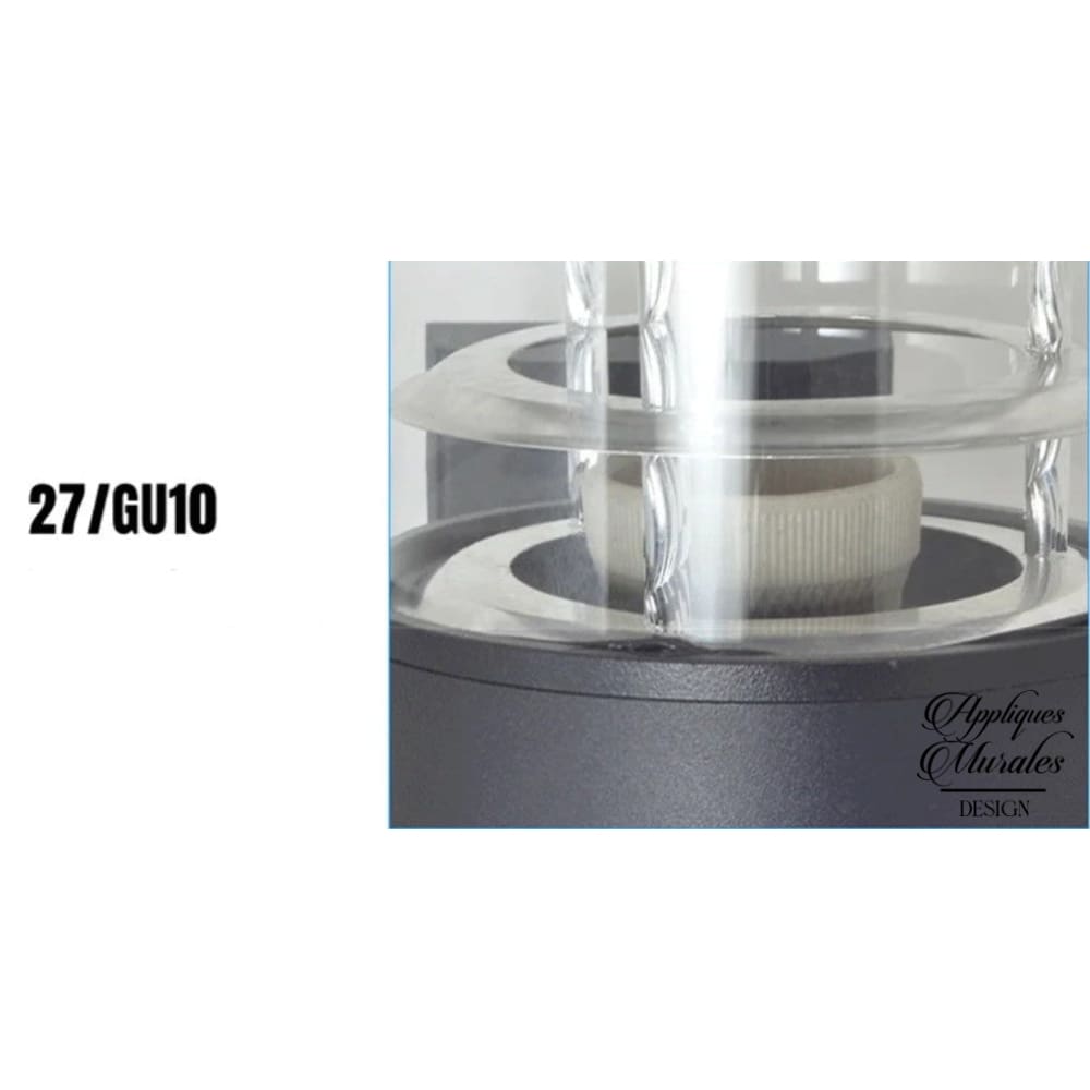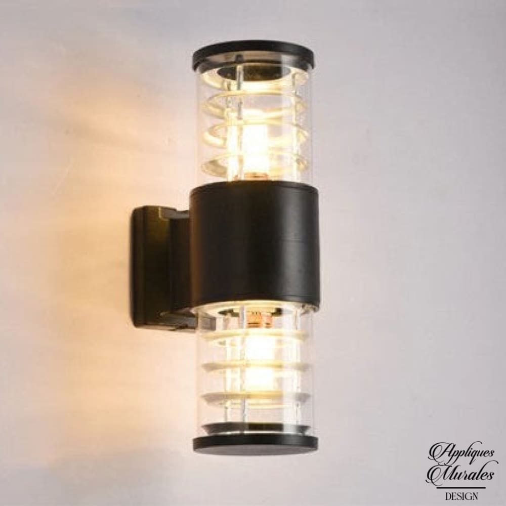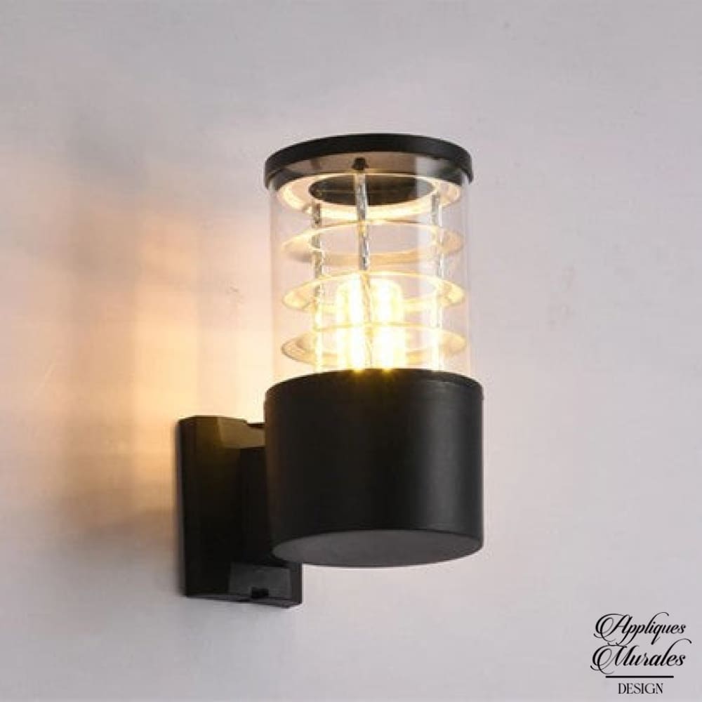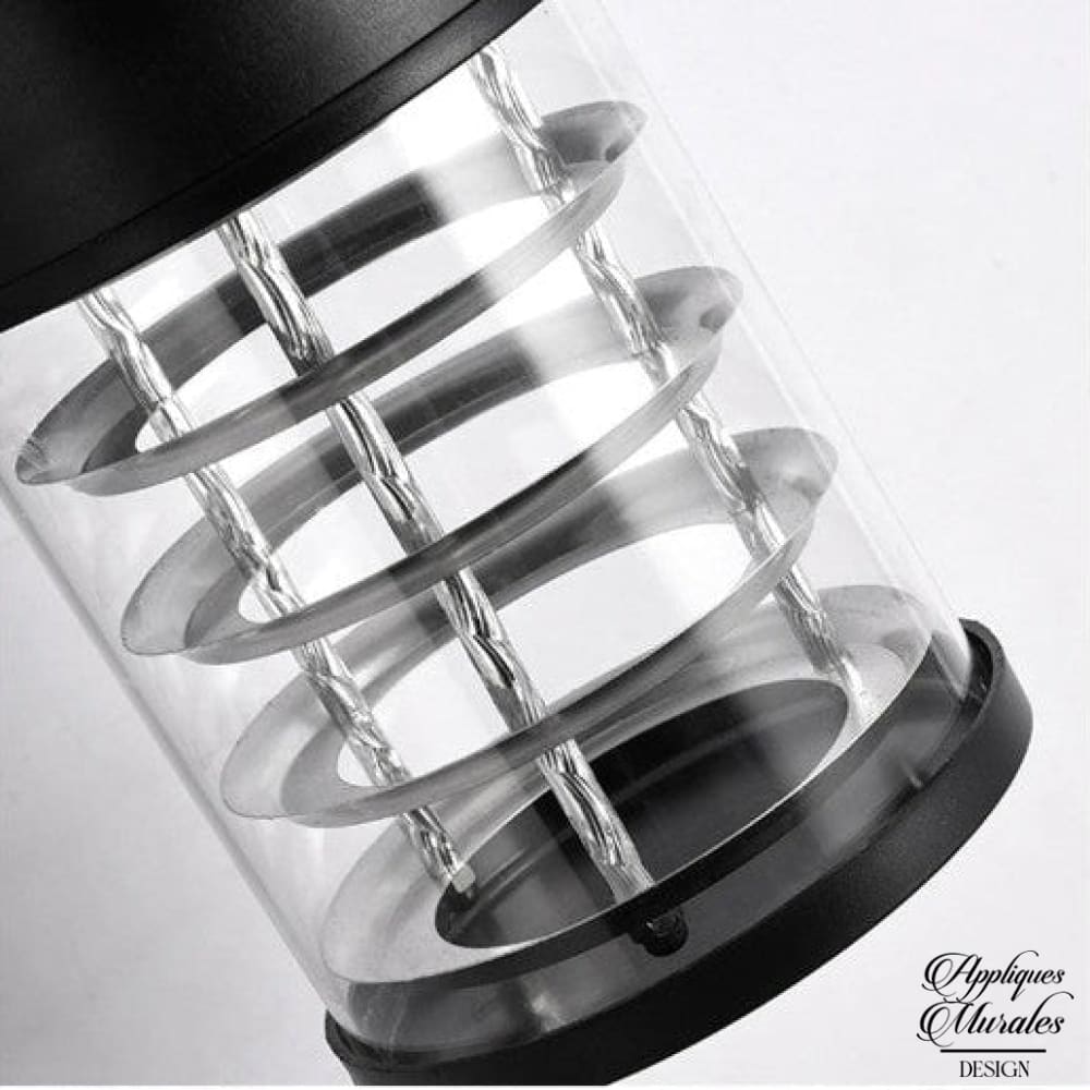 Laissez-vous séduire par cette applique murale extérieure pour terrasse s’apparente à une colonne de lumière, une structure cylindrique transparente où des anneaux métalliques semblent flotter en apesanteur.